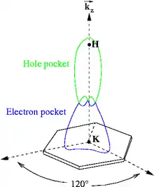 Los materiales que presentan estructuras cristalinas complejas pueden tener superficies de Fermi bastante intrincadas. La figura muestra la superficie de Fermi anisótropa del grafito, que tiene zonas tanto de electrón como de hueco en su superficie de Fermi debido a las múltiples bandas que atraviesan la energía de Fermi a través de la dirección . A menudo en un metal el radio de la superficie de Fermi es mayor que el tamaño de la primera zona de Brillouin, lo que resulta en una parte de la superficie de Fermi que se encuentra en la segunda zona (o mayores). Al igual que la propia estructura de bandas, la superficie de Fermi se puede mostrar en un esquema de zona extendida donde se permite que tenga tamaños arbitrariamente grandes, o en un esquema de zona reducida donde los vectores de onda tengan módulo (en el caso unidimensional), donde es el parámetro de red. En el caso tridimensional, el esquema de zona reducida equivale a que de cualquier vector de onda existe un número apropiado de vectores de la red recíproca tales que el nuevo es más cercano al origen en el -espacio que cualquier . Los sólidos con gran densidad de estados al nivel de Fermi se vuelven inestables a bajas temperaturas y tienden a formar estados fundamentales donde la energía de condensación proviene de abrir un hueco en la superficie de Fermi. Ejemplos de estos estados fundamentales son los superconductores, materiales ferromagnéticos, distorsiones Jahn-Teller y ondas de densidad de espín.