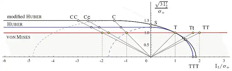 El criterio de Huber y el criterio de Huber modificado deben preferirse al criterio de von Mises, ya que se obtienen resultados más seguros en la región . Para aplicaciones prácticas, en estos criterios se debe considerar el tercer invariante del desviador .[15]