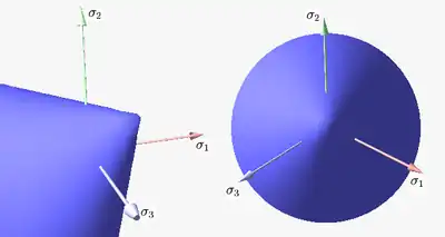 La Figura 7 muestra la superficie de fluencia de Drucker-Prager en el espacio tridimensional de tensiones principales. Es un cone normal. La Figura 8 muestra la superficie de fluencia de Drucker-Prager en un espacio bidimensional. El dominio elástico elíptico es una sección transversal del cono en el plano de ; se puede elegir para cruzar la superficie de cedencia de Mohr-Coulomb en diferente número de vértices. Una opción es intersecar la superficie de fluencia de Mohr-Coulomb en tres vértices a cada lado de la línea , pero generalmente se seleccionan por convención para que sean aquellos en el régimen de compresión.[19] Otra opción es intersecar la superficie de cedencia de Mohr-Coulomb en cuatro vértices en ambos ejes (ajuste uniaxial) o en dos vértices en la diagonal (ajuste biaxial).[20] El criterio de fluencia de Drucker-Prager también se expresa comúnmente en términos de la cohesión del material y del ángulo de fricción.