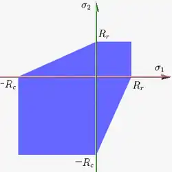 y los parámetros y son los esfuerzos de fluencia (fallo) del material en compresión y tensión uniaxial, respectivamente. La fórmula se reduce al criterio de Tresca si .