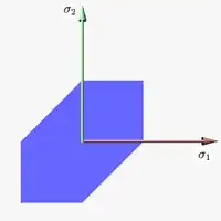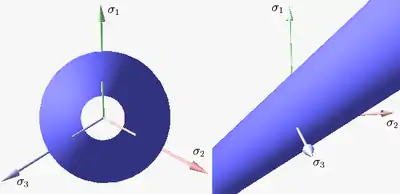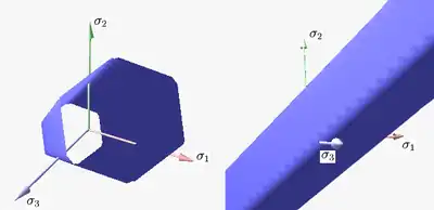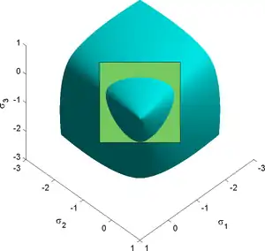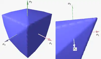 El criterio de Huber consta del elipsoide de Beltrami y un cilindro de von Mises escalado en el espacio de tensión principal,[10][11][12][13] ver también[14][15]