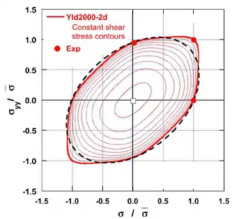 Para los materiales anisotrópicos, dependiendo de la dirección del proceso aplicado (por ejemplo, laminado), las propiedades mecánicas varían y, por lo tanto, es crucial utilizar una función de fluencia anisotrópica. Desde 1989 Frédéric Barlat desarrolló una familia de funciones de fluencia para el modelado constitutivo de la anisotropía plástica. Entre ellos, el criterio de fluencia Yld2000-2D se ha aplicado para una amplia gama de láminas metálicas (por ejemplo, aleaciones de aluminio y aceros avanzados de alta resistencia). El modelo Yld2000-2D es una función de fluencia de tipo no cuadrático basada en dos transformaciones lineales del tensor de tensión: