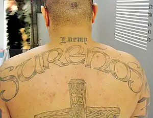 ![]() El nombre de la pandilla tatuado en la espalda de uno de sus miembros | ||