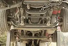 También utilizaba un dead axle, o eje rígido arrastrado con el diferencial anclado al chasis formando parte de la masa no suspendida, del que salían los palieres, conectados a ruedas dentadas. Como sistema para transmitir la potencia del diferencial al eje empleaba dos cadenas gemeleas que conectaban las ruedas dentadas con piñones en cada una de las ruedas, las cadenas también transmitían el empuje de las ruedas al bastidor, mientras que la deformación de las ballestas controlaba el par de reacción.