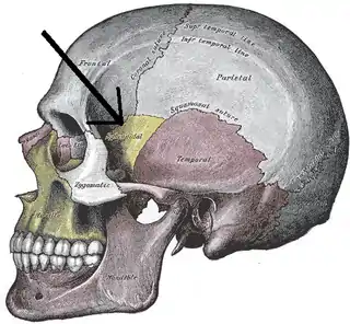 ![]() Vista lateral de la cabeza ósea. (Sutura esfenofrontal visible en el centro, entre el hueso esfenoides, coloreado en amarillo en el diagrama, y el hueso frontal, coloreado en gris arriba a la izquierda). | ||