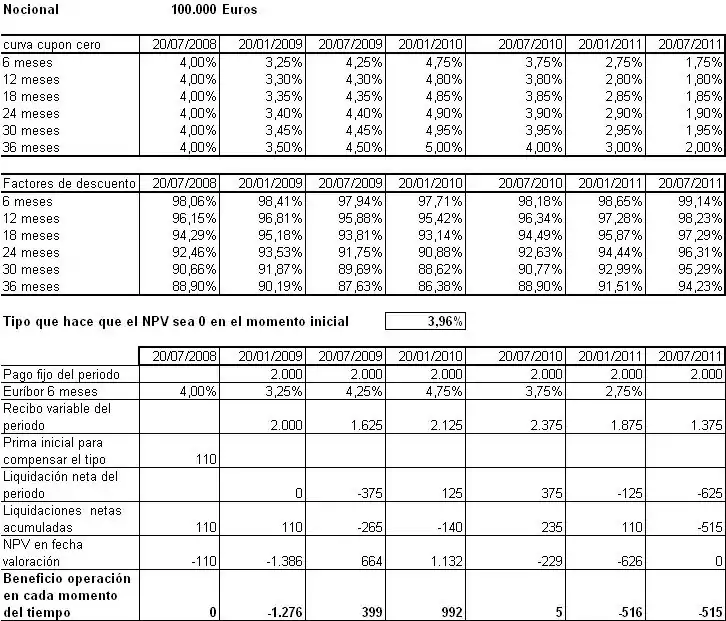 En la tabla siguiente se reflejan los valores de la operación de permuta del ejemplo en el tiempo, suponiendo una evolución de los tipos de interés según se indica en la misma. Suponemos que somos la contrapartida que paga el tipo fijo. Es interesante observar los siguientes puntos: