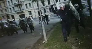 La táctica implica que agentes de policía persigan a las personas con un bastón contra una multitud de personas y, en algunos casos, usan los escudos antidisturbios para empujarlos. También consiste en correr y detenerse por momentos y después correr nuevamente hacia la multitud golpeando a la gente con sus Bastones y, en algunas situaciones, usan escudos antidisturbios para alejarlos. La táctica de bastón está diseñada para causar dolor o miedo, con la esperanza de que las multitudes se vean obligadas a alejarse del lugar y dispersarlas.[1]