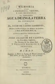 Sarmento creó una rentable red de distribución de Agua de Inglaterra en Portugal y se convirtió en una de los fármacos más consumidos en el país. Otros, incluido el sobrino de Castro Sarmento, quien afirmó que su tío había compartido la fórmula con él, produjeron sus propias versiones falsificadas.[22][25] Los derechos del hijo del sobrino a este respecto fueron disputados en el Parlamento portugués en fecha tan tardía como 1821, habiendo sido previamente respaldados por el Príncipe Regente. Dos farmacéuticos de Lisboa también produjeron sus propias versiones.[24]