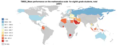 Los estudiantes de 8.º grado en los Estados Unidos también estaban rezagados con respecto a los alumnos de las mejores naciones asiáticas y europeas. Desglosado por raza, en matemáticas, los asiáticos estadounidenses (sin distinción entre los asiáticos orientales y otros asiáticos) obtuvieron resultados comparables con los del Sudeste Asiático, con 549. Las notas de los estadounidenses blancos fueron similares a las logradas por los alumnos de los mejores países de Europa, con 533, los hispanoamericanos promediaron 475, equiparables a los estudiantes de Malasia y de Noruega, y los afroamericanos, con 457, eran comparables a los alumnos de Bosnia y Herzegovina, así como de Líbano.[5]