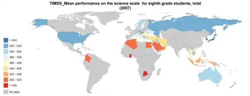 El aprovechamiento en los EE. UU. en relación con los otros países disminuyó con el aumento de edad: los del grado 12 se desempeñaron peor que los de 8.º grado, los cuales a su vez rindieron peor que los de 4.º grado.[4]