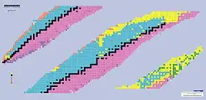 - Más allá de la línea del límite de inestabilidad de protones a lo largo de la esquina superior derecha, los nucleidos se desintegran por emisión de protones. Solo se han establecido líneas de límite de inestabilidad para algunos elementos.