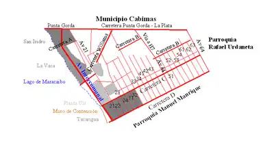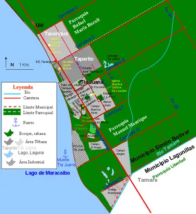 Tacarigua comienza exactamente al sur del complejo Ulé, que es lo único que la separa de La Vaca, y al norte del campo y Patio de Tanques Taparito, del cual lo separa un río. Originalmente una hacienda, sus terrenos se encuentran bajo el nivel del mar protegidos por el muro de contención. A diferencia de La Vaca que tiene depósitos de materiales y vehículos, Tacarigua tiene una activa vida comercial con tiendas, abastos, talleres y demás que incluso Tía Juana no tiene.