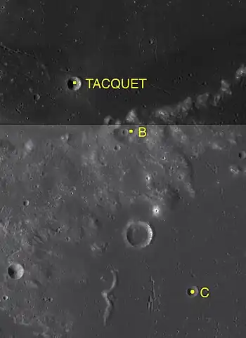 Tacquet B, de 14 km de diámetro, está al sureste, y en su interior contiene un cráter más pequeño que cubre aproximadamente una cuarta parte del diámetro, formando un cráter doble. Más al sur-sureste se halla Tacquet C, de 6 km de diámetro.