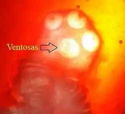 ![]() Proglotides grávidas de Taenia saginata, con un característico número de úteros laterales de entre 15-20. Tinción de tinta china. | ||