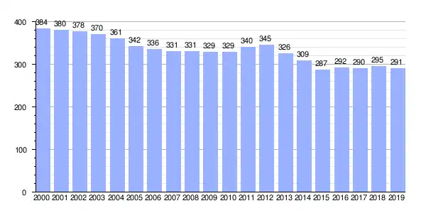 | Gráfica de evolución demográfica de Tarás (parroquia) entre 2000 y 2019 |