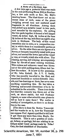 - Anonymous, (June 5, 1852) "A Relic of a By-Gone Age". Scientific American. vol. 7, no. 38, p. 298.