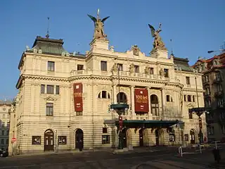 Inició su construcción el 27 de febrero de 1905, y se inauguró el 24 de noviembre de 1907. Proyectado por el arquitecto Alois Čenský, más tarde sería remodelado/reconstruido por los arquitectos Antonín Turek y Joseph Mocker. Tiene estatuas de Milan Havlíček y una cortina pintada por Vladimír Županský, que representa una musa desnuda.[1]