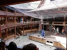 En los siglos XVI y XVII abundaba la parte de la «escena múltiple», sea en horizontal o en vertical, que obligaba al espectador a seguir la acción en los distintos cuadros. El lugar escénico se hizo fijo después de 1580, con la proliferación en las grandes ciudades de Inglaterra y España de los primeros teatros y corrales de comedias. En origen se trataba de un escenario ubicado permanentemente en algún patio entre edificios, estructura que se siguió en la construcción de los primeros teatros isabelinos y corrales de comedia. Al fondo se situaba el escenario, un tablado elevado unos dos metros sobre el suelo que tenía tres niveles: balcón, tablas y trampa. El público se distribuía de acuerdo a su condición social y, en las clases populares, también por sus diferencias de sexo. Frente al escenario estaba el patio, donde se situaban los denominados «mosqueteros», hombres corrientes, un público alborotador. En la pared opuesta al escenario se ubicaba la «cazuela», lugar donde se colocaban las mujeres. En los laterales, las ventanas y balcones más bajos, denominados «aposentos», eran el lugar de la nobleza. Había también un lugar específico para curas, frailes, escritores y otro para las autoridades. El ambiente era de diversión y fiesta. Comida, bebida, alborotos, gritos y silbidos o incluso peleas eran actividades relativamente habituales. Las representaciones eran diurnas y seguían un esquema prefijado: en primer lugar la loa, una presentación en verso que buscaba conseguir el favor de la audiencia; luego se presentaban las tres jornadas o actos de la comedia, entre las que se intercalaban pequeñas piezas como entremeses, bailes o jácaras ; se finalizaba con una mojiganga tras la tercera jornada.[2] En los corrales el decorado solía ser muy simple (algunas cortinas sencillas y un par de piezas de mobiliario) y los cambios de escena o lugar de la acción se indicaban a través del texto y se dejaban a la imaginación de los espectadores, como se puede ver en Los embustes de Fabia, de Lope de Vega:[3][4] «Este es palacio: acá sale / Nerón, nuestro Emperador, / Que lo permite el autor / que desta industria se vale; / Porque si acá no saliera, / Fuera aquí la relación / Tan mala y tan sin razón / Que ninguno la entendiera.»