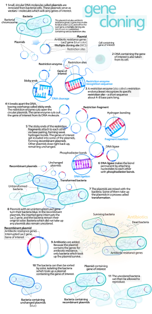 En protocolos de clonación estándar, la clonación de cualquier fragmento de ADN implica esencialmente siete pasos: (1) Elección del organismo huésped y del vector de clonación, (2) Preparación del vector de ADN, (3) Preparación del ADN para clonación, (4) Creación del ADN recombinante, (5) Introducción del ADN recombinante en el organismo huésped, (6) Selección de organismos que contengan ADN recombinante, y (7) Proyecciones para clones con las inserciones del ADN deseado y con propiedades biológicas.[4] Los pasos anteriores están descritos con detalle en el artículo relacionado: (Clonación molecular).