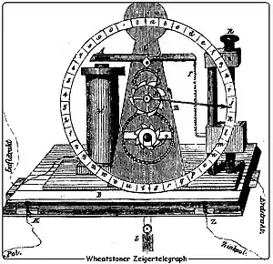 El primer telégrafo de puntero fue construido en 1839 por el físico e inventor británico Charles Wheatstone. En este dispositivo, una manecilla controlada por un mecanismo de relojería unido a la armadura de un electroimán podía detenerse frente a cualquiera de las letras seleccionadas por otra aguja igual en un dial situado en una estación remota.