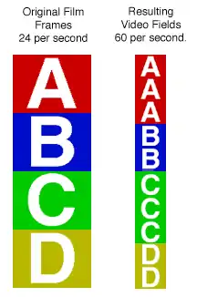 Estos cuatro fotogramas "estiran" haciendo cinco aprovechando la naturaleza entrelazada del Vídeo de 60 Hz. Para cada fotograma, en realidad hay dos cuadros o campos incompletos, uno para las líneas impares de la imagen y uno para las líneas pares. Hay, por tanto, diez campos por cada cuatro cuadros de vídeo, que se denominan A, B, C y D. El telecine pone alternativamente un cuadro "A" en medio de dos campos, un cuadro B en medio de tres campos, uno cuadro C en medio de dos campos y un cuadro D en medio de tres campos. Se puede escribir como AABBBCCDDD oro 2-3-2-3 o simplemente 2-3. El ciclo se repite completamente tras exponer cuatro cuadros de la película: