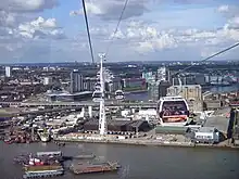 El extremo oriental de la línea del teleférico (51,5077°N 0,0178°E) se encuentra en la Royal Docks, el hogar de la ExCeL Londres, que fue sede de una serie de artes marciales, boxeo y eventos de levantamiento de pesas en los Juegos Olímpicos de Londres 2012. El intercambio más cercano a la Docklands Light Railway está en la estación Royal Victoria.