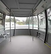 Las cabinas del teleférico pesan aproximadamente 12 toneladas y miden 7,5 m por 3,3 m. Cada una tiene una capacidad de más de 13 toneladas y hay espacio suficiente en la cabina para 78 pasajeros y un operador. Los teleféricos fueron construidos por la firma Gangloff Switzerland[15] en Berna, Suiza, y su forma y color encarna la visión del estudio de arquitectura de “burbujas flotando en el cielo". La superficie de las cabinas refleja y refracta la luz, minimizando su impacto visual en el barrio que está debajo.[16][17] Las cabinas del lado sur y del lado norte se llaman Jean y Walt respectivamente; fueron llamadas así en honor de Jean Richardson, la primera mujer que se graduó como ingeniera en la Universidad Estatal de Oregón, y de Walt Reynolds, el primer afroamericano que se graduó de OHSU, conocida en aquella época como Escuela de Medicina de la Universidad de Oregón.[18]