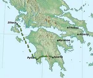 En el libro 2 Telémaco intenta consolidar su autoridad cuando ordena a los pretendientes que se marchen de su país. Pero como Telémaco es, según sus propias palabras (61-2), "un alfeñique sin valor alguno", los pretendientes se niegan. Telémaco anuncia entonces su intención de visitar Esparta y Pilos en busca de noticias sobre su padre. Su primer viaje lejos de casa es una parte importante del tránsito figurativo de la adolescencia a la madurez.