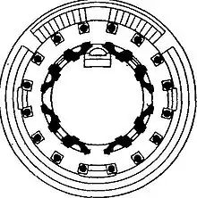 Al igual que en las edificaciones clásicas, el espacio entre columnas se mantiene constante a los largo de su perímetro, por tanto la disposición de estas no proporciona ninguna indicación acerca de la situación del altar en el interior de la cella.