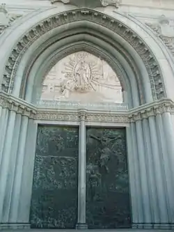 Las puertas de la fachada del templo son de bronce. Los bastidores son de hierro, fundidos en la ciudad de Monterrey, y forrados con hojas de bronce esculpidas en sobre relieve con motivos religiosos. El diseño, idea artística y ejecución en su totalidad fueron obra del escultor y arquitecto mexicano José Carlos Ituarte González.