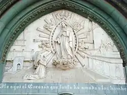El tímpano de la puerta principal central nos recuerda el origen de la Devoción al Sagrado Corazón de Jesús, en él se puede leer: "¡He aquí el Corazón que tanto ha amado a los hombres!".