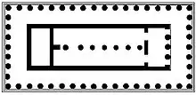 En total, la perístasis tiene 50 columnas, y al tener nueve columnas en el lado corto, que es inusual, denota el modelo arcaico del edificio y obliga a tener una columnata axial en la cella. En este caso, son ocho columnas, de las cuales, las de los extremos están unidas a las paredes interiores del naos. Además dispone de un pronaos con tres columnas entre antas y un opistodomos.