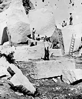 Los cimientos de la esquina sudeste fueron completados en julio de 1855. Originalmente se usó arenisca para la fundación. Los restantes cimientos fueron colocados en los meses subsiguientes hasta 1857 cuando las bases del templo fueron recubiertos con tierra para esconder el edificio de las fuerzas militares estadounidenses que se aproximaban al territorio de Utah en respuesta de la Ley Edmunds-Tucker para mitigar reportes de intentos violentos por parte de la población mormona.[3]: 133 Al desenterrarse luego los cimientos del edificio, los ripios que cubrían las bases del edificio carecían de la estabilidad necesaria para sostener la monumental estructura, los cuales fueron sustituidos por roca de mejor calidad, parte granito y parte arenisca.[19] La arenisca fue reemplazada por un tipo de cuarzo muy similar al granito extraído de cañones unos 30 kilómetros del terreno del templo. La roca era transportada por bueyes hasta la construcción del ferrocarril transcontinental en 1869. Se requerrían cuatro bueyes para transportar cada bloque de granizo y tres a cuatro días de camino para transportarlos.[2]: 89 Por lo laborioso del transporte, se diseñaron canales para transportar las rocas por agua pero con el anuncio de la llegada del ferrocarril, estos canales, algunos de los cuales fueron iniciados, nunca llegaron a completarse.[2]: 41, 57