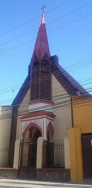 El Templo presenta un estilo neogótico, tiene una sola nave y una torre con cimborrio.