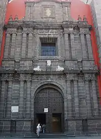 Esta fachada, ejemplo del más bello barroco poblano de exteriores, albergaba al Portal de Peregrinos y en su interior la Capilla de Profundis que servía para el entierro de los religiosos, actualmente se observan sus tres arcos tapados y en la parte alta con exuberante decoración manierista las ventanas hoy convertidas en balcones.