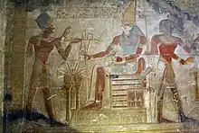 Otros rituales oferentes tenían lugar al mediodía y al atardecer, aunque el sancta sanctorum del dios no era reabierto.[154] Otras ceremonias también se hacían diariamente, incluidos los rituales específicos de cada dios. Por ejemplo, en el culto al dios solar Ra se cantaban himnos día y noche por cada hora de viaje del dios a través del cielo.[158] Otros rituales servían para luchar contra las fuerzas del caos y podían implicar la destrucción de imágenes de dioses hostiles como Apep o Seth, actos que se creía que tenían un efecto real mediante los principios de la magia egipcia.[155]