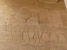 Las ceremonias de los festivales incluían la recreación de pasajes mitológicos o la realización de otros actos simbólicos, como la siega del trigo durante el festival de la cosecha dedicado al dios Min.[166] Ceremonias como esta tenían lugar solo dentro del recinto del templo, pero otros festivales implicaban la visita al templo del dios u otro, ocasión en la que se celebraba el festival procesional, cuando los sacerdotes portaban la imagen divina dentro de la barca en un viaje que se podía hacer enteramente por tierra o implicar el embarque en un navío real para navegar por el Nilo.[167]
