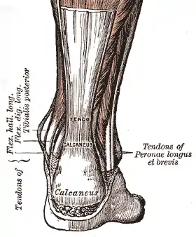 ![]() Vista posterior del pie y la pierna, mostrando el tendón de Aquiles (tendo calcaneus). | ||