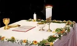 La Eucaristía es un sacrificio en el sentido de que literalmente re-presenta (en el sentido de "hace presente de nuevo") el mismo sacrificio ofrecido por Jesús en la cruz,[30] en el que el sacrificio de Jesús y el sacrificio de la Eucaristía se consideran un único sacrificio; no se considera que la Eucaristía sacrifique a Jesús por segunda vez. La Misa es una representación litúrgica de un sacrificio que hace presente lo que representa mediante la acción de Dios de forma incruenta.[31] La Eucaristía no es una mera conmemoración del sacrificio de Jesús en el Gólgota: también hace verdaderamente presente ese sacrificio. El sacerdote y la víctima del sacrificio son uno y el mismo (Jesús), con la diferencia de que la Eucaristía se ofrece de manera incruenta.[32]