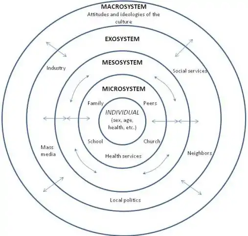 Esta teoría expone el desarrollo de la conducta humana, a partir de los niños, dentro de los contextos de los sistemas de relaciones que forman su entorno. Esta perspectiva concibe al ambiente ecológico como un conjunto de estructuras seriadas y estructuradas en diferentes niveles, en donde cada uno de esos niveles contiene al otro. Identifica 5 sistemas ambientales con los cuales interactúa un individuo y proporciona el marco desde el cual los psicólogos comunitarios estudian las relaciones persona-ambiente (contexto): microsistema, el mesosistema, el exosistema, el macrosistema y el cronosistema.[2]