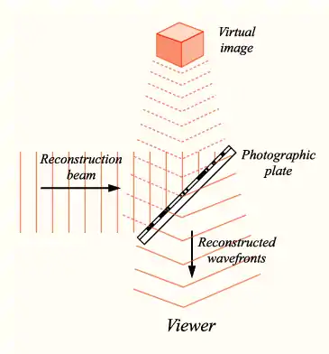 Cuando un holograma —resultante de un patrón de interferencia entre dos porciones de luz láser— se imprime en una película fotográfica, se puede cortar en dos sin perder nunca la mitad de la imagen original, que permanece completa (aunque con cierta pérdida de resolución).[32][33] La imagen completa persiste incluso si las dos mitades de la película se cortan en elementos más pequeños. Cada parte de la película contiene todo el espacio necesario para la completa reproducción de la imagen. En la analogía del holograma, la superficie de la película fotográfica que contiene la información visual se convierte entonces en la metáfora del orden implicado, mientras que el holograma mismo representa el orden explicado, es decir, la explicación en nuestra realidad de un orden oculto donde cada parte contiene el orden total. El «movimiento holográfico» está representado por la luz láser proyectada sobre la placa fotográfica, ilustrando la naturaleza dinámica de la realidad holográfica.[34]
