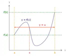 En análisis matemático el teorema del valor intermedio[1] (o más correctamente teorema de los valores intermedios, o TVI), es un teorema sobre funciones continuas reales definidas sobre un intervalo. Intuitivamente, el resultado afirma que, si una función es continua en un intervalo, entonces toma todos los valores intermedios comprendidos entre los extremos del intervalo.