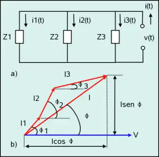 Sea el circuito paralelo y su correspondiente diagrama fasorial, figuras 2a y 2b respectivamente. Las componentes activa y rectiva de la corriente total, e , vienen dadas como suma de las componentes parciales de cada una de la corrientes que circulan por cada rama: