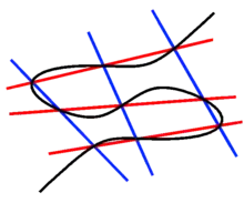 Según el teorema de Bézout, 9 es el número máximo posible de diferentes intersecciones, siempre que las dos curvas no tengan un componente común. Sobre un campo algebraicamente cerrado, este número máximo siempre se alcanza si los puntos son todos diferentes.