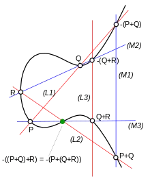 Con la ayuda del teorema de Cayley-Bacharach, es fácil probar la ley asociativa para la adición de curvas elípticas: sean , y tres puntos en una curva elíptica, y el punto que representa el elemento neutro. Entonces se forman las tres rectas , y que definen una cúbica, así como las tres líneas rectas , y , que dfinen una segunda cúbica. Las intersecciones de estas dos cúbicas son , , , , , , (en la recta y ) (en la recta y ), así como la intersección de y . La curva elíptica contiene los primeros ocho puntos, incluido el último. En consecuencia,