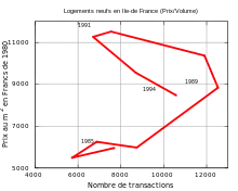 Este fenómeno es ilustrado por el diagrama a la derecha, que muestra la relación entre los precios y el volumen de ventas de viviendas (casa y pisos) nuevos en la región central de Francia entre 1985-1994. En la práctica, el modelo se aplica principalmente a bienes y servicios cuya producción es discontinua, tales como productos agrícolas.[1]