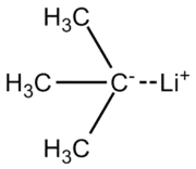 El enlace litio-carbono en el tert-butillitio está altamente polarizado y tiene un carácter iónico de alrededor del 40 por ciento. La molécula reacciona como un carbanión, como lo representan estas dos estructuras de resonancia.[4] (Dados los cálculos de polaridad en el enlace C-Li, la estructura "real" de una sola molécula de t-butil-litio es probablemente un promedio cercano de los dos contribuyentes de resonancia que se muestran, en los que el átomo de carbono central tiene un ~ 50% parcial carga negativa mientras que el átomo de litio tiene una carga positiva parcial ~50%).