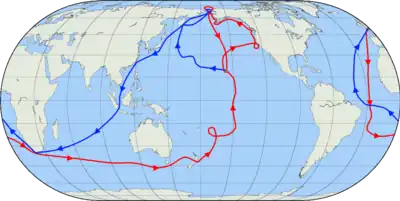 El tercer y último viaje de James Cook (12 de julio de 1776 - 4 de octubre de 1780) tomó la ruta de Plymouth a través de Ciudad del Cabo y Tenerife a Nueva Zelanda y las islas hawaianas, y a lo largo de la costa norteamericana hasta el Estrecho de Bering.