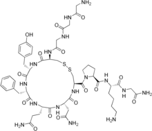 | 1-{[(4R,7S,10S,13S,16S,19R)-19-{[({[(aminoacetil)amino]acetil}amino)acetil]amino}-7-(2-amino-2-oxoetill)-10-(3-amino-3-oxopropil)-13-benzil-16-(4-hidroxibenzil)-6,9,12,15,18-pentaoxo-1,2-ditia-5,8,11,14,17-pentaazacicloicosan-4-yl]carbonil}-L-prolil-N-(2-amino-2-oxoetil)-L-lisinamida | ||
