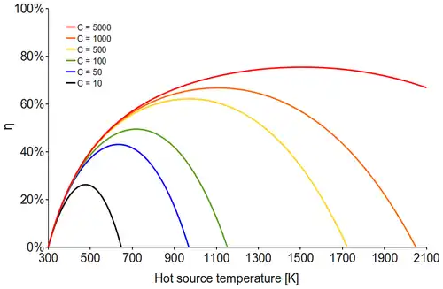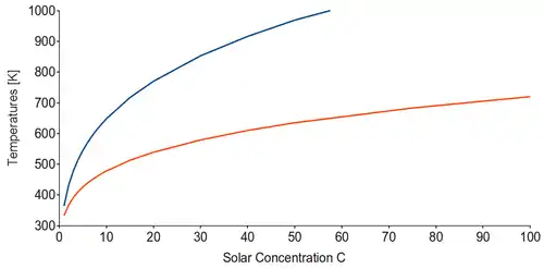 Las tecnologías de concentración existen en cuatro formas comunes, cilíndrico parabólico, discos Stirling, reflector fresnel lineal compacto y torre de energía solar.[11] Aunque simples, estos concentradores solares están lejos de la capacidad de concentración máxima.[12][13] Por ejemplo, la concentración cilíndrico parabólica logra 1/3 del máximo teórico para el ángulo de aceptación de diseño, esto es, para la misma tolerancia total para ese sistema. Se puede lograr una aproximación al máximo teórico usando concentradores más elaborados basados en óptica no formadora de imágenes.
